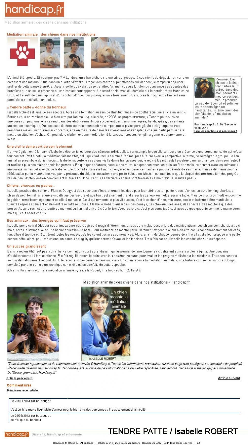 Isabelle Robert est auteur du livre “Le coeur sur la patte” qui explique ce que nous avons dit plus haut.Dans cet ouvrage nous suivons les pas ou plutôt les pattes d’un chien médiateur qui nous invite à le suivre dans différentes prise en charge de personne, sourires et émotions sont au rendez vous. Selon ce qu’elle en dit, c’est une technique qui commence par avoir du succès auprès des uns et des autres. Elle s’est officialisée dans le secteur en 2008.